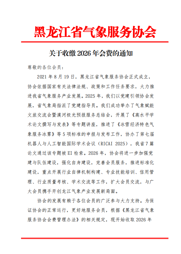 黑龙江省气象服务协会成立于2021年4月6日,现有企事业会员单位31家,会长1名,副会长3名,秘书长1名。协会筹备设立专家委员会和专业委员会,拟成立气象传媒委员会、气象装备委员会、防雷减灾委员会、气候可行性论证委员会、能源气象委员会、旅游气象委员会和应急预警委员会共计七个专业委员会。